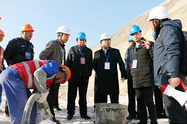 公安部三局马维亚副局长、浙江省公安厅金伯中副厅长(右三)共同出席在项目部会议室召开的现场混装炸药观摩座谈会